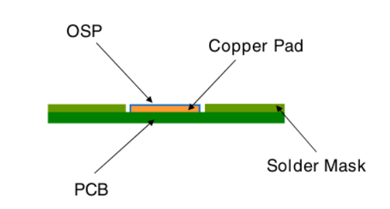 OSP(有機助焊保護膜)于20世紀90年代興起,通過含有苯駢三氮唑(BTA)、咪唑、烷基咪唑、苯駢咪唑等的水溶液與清潔銅表面發生反應,形成一層有機絡合物保護膜,有效防止銅表面氧化。