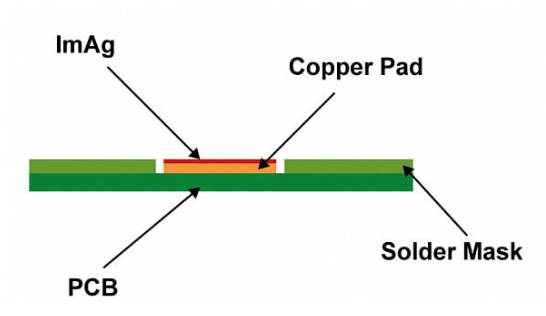 Ag具有優異的導熱性、導電性、焊接性,反光能力強,高頻損耗小,表面傳導能力高 ,在PCB焊盤涂層中應用廣泛。然而,Ag對S親和力極高,易與大氣中微量的S(H?S、SO?或其他硫化物)反應生成Ag?S、Ag?O,導致表面變色、喪失可焊性;此外,在潮濕環境下,Ag離子易沿絕緣材料表面及內部遷移,造成絕緣性能劣化甚至短路。Im-Ag工藝在基材銅上沉積的Ag層厚度為0.075 - 0.225μm,表面平滑,可滿足引線鍵合需求。