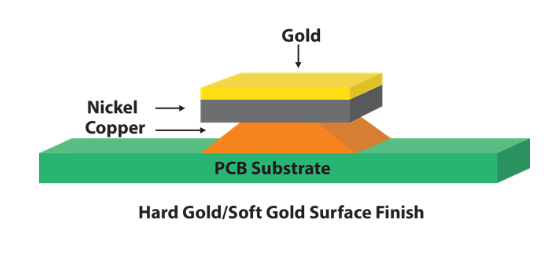 硬金:純度約 99.6%,為金 - 鈷 / 鎳 / 鐵合金,常用于金手指、PCB 觸點等高磨損區域。其厚度依據應用場景而定,如 IPC 1/2 類應用建議金層 25μin、鎳層 100μin,3 類應用建議金層 50μin、鎳層 100μin;