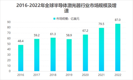 在半導體激光加工應用以及中高功率光纖激光器差異需求的推動下,具有中高率、高光束質量的半導體激光器快速發展,半導體激光器也成為光電行業中最有發展前景的領域之一。數據顯示,全球半導體激光器市場規模穩步提升,2021年全球半導體激光器市場規模達到79.46億美元,同比增長18.17%。2022年市場規模約為87.0億美元。